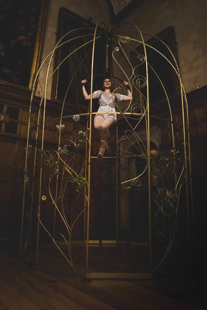 A giant birdcage covered in flowers. Inside an aerial performer sits in an elegant pose whilst reaching for the camera.