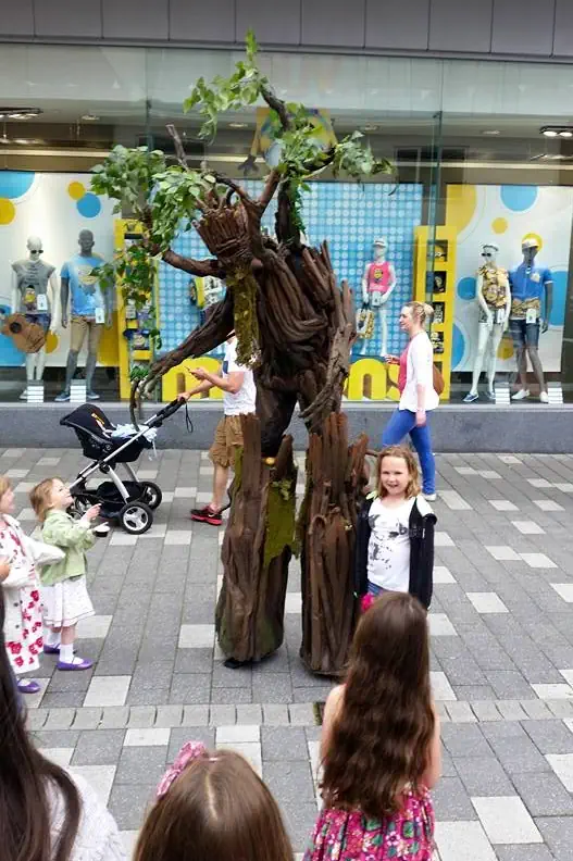 • The costume is two main parts – the undersuit, which can be put on in any suitable room, and the large tree costume. The costume is about 9ft tall when fully on, and often normal rooms prove problematic. We are always happy to be flexible to help solve this – often we’ll put on the bulk of the costume in an outdoor space, or another space seperate to the changing area. This works best when it is out of sight of the public, but that is not a strict requirement from our end.